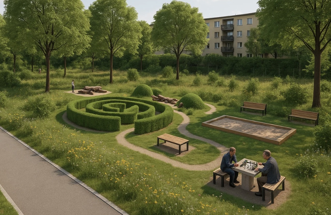 W centralnym miejscu (obecnie zarośniętym w niewielkim stopniu tylko niskimi roślinami) stworzymy naturalne atrakcje – labirynty z krzewów, niewielkie pagórki, kłody do wspinania i naturalną piaskownicę. Obok staną ławki oraz stolik do gry w szachy.