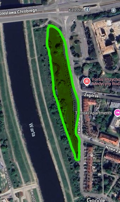 Zieleniec wzdłuż ulicy Wieżowej na Zagórzu od mostu B. Chrobrego (z wyłączeniem strefy objętej pracami związanymi z remontem mostu oraz wyłączeniem terenów nienależących do Miasta Poznań)
