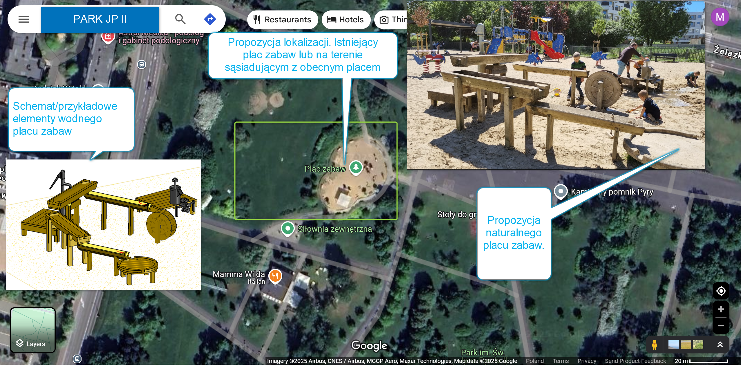 Stworzenie ogólnodostępnego naturalnego wodnego placu zabaw w parku JP II. Wodny plac zabaw wniósłby nową jakość do parku JPII w obszarze rozrywki dla dzieci. Byłby świetnym uzupełniem placu i pozwoliłby dzieciom na nowy rodzaj zabaw sensorycznych przy pomocy wody i piasku.(Zał_1_Proponowana_lokalizacja)